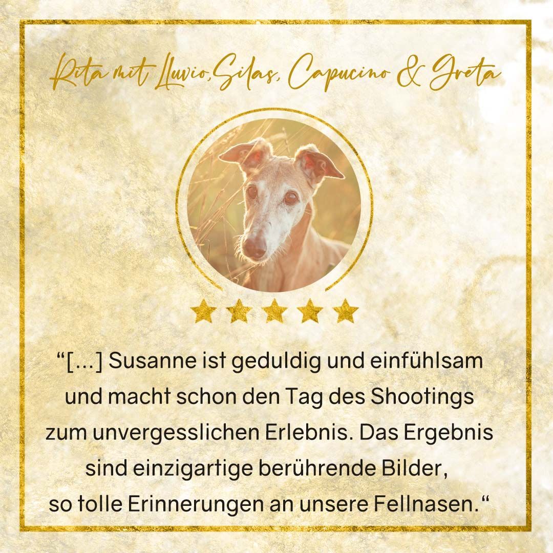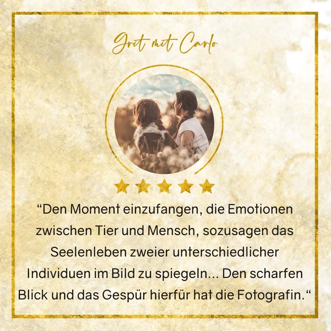 Meine Mission: Es euch so angenehm und einfach wie möglich zu machen. Je nach Situation halte ich natürliche Momente fest oder leite euch für eine stimmige Bildwirkung an. Wir gestalten das Shooting mit viel Spaß für alle und interessanten Anreizen für die Vierbeiner. Dank langjähriger Erfahrung fange ich aktive und freudige ebenso wie entspannte und innige Augenblicke optimal ein.
